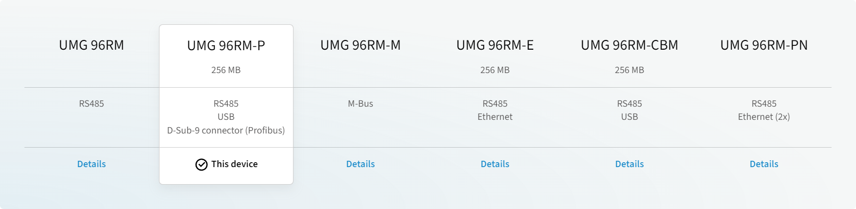 O medidor multifuncional UMG 96RM foi projetado principalmente para uso em sistemas de distribuição de baixa e média tensão. O dispositivo mede correntes harmônicas até a 40ª harmônica e possui componentes de campo rotativo. O dispositivo possui até quatro entradas digitais e seis saídas digitais. O armazenamento de dados de medição é de 256 MB.